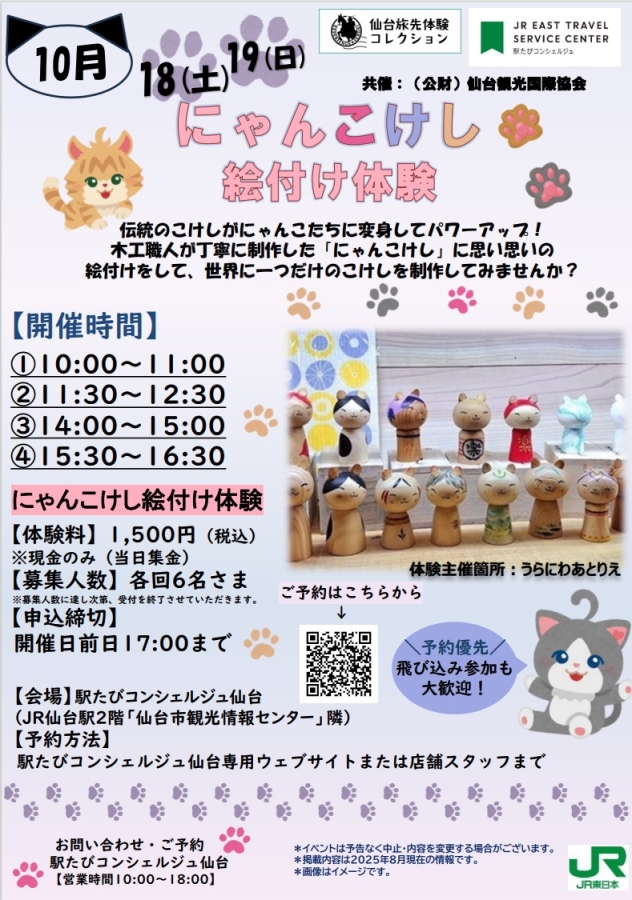 JR仙台駅2階にある「駅たびコンシェルジュ仙台」にて「にゃんこけし絵付け体験」を開催いたします♪
