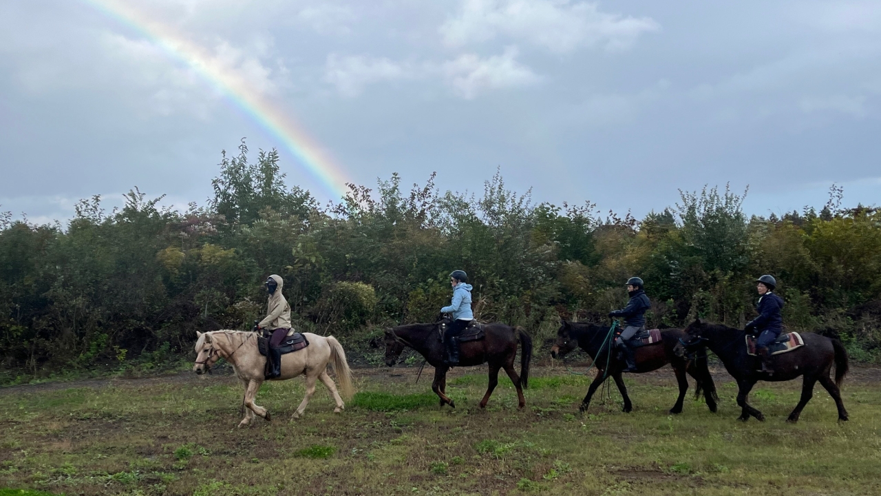 柵に囲まれた馬場から飛び出して自然の中を自由に馬で行く。一人で馬を動かし常歩・速歩で自然の中をトレッキングし乗馬の楽しさを発見。バランスが良ければ駈歩にもチャレンジできます。馬の背で自然を満喫し心をリフレッシュ。温和で乗りやすい体高の低い和種系の馬を使うので老若男女を問わず誰でも安心して乗れます。
